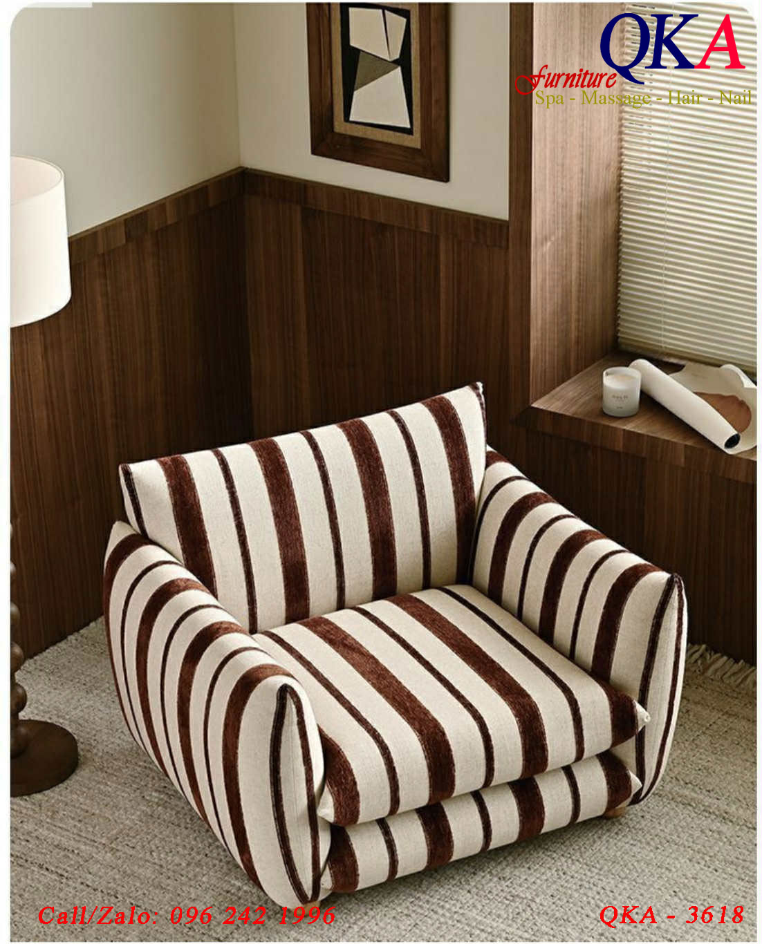 Ghế sofa đơn QKA – 3618 nổi bật với thiết kế độc đáo gồm các sọc nâu trắng đối xứng, tạo điểm nhấn thẩm mỹ cho không gian sống. Với kích thước nhỏ gọn, mẫu ghế này phù hợp với nhiều không gian như phòng khách, phòng ngủ, phòng làm việc hay khu vực tiếp khách trong spa, salon, nail…