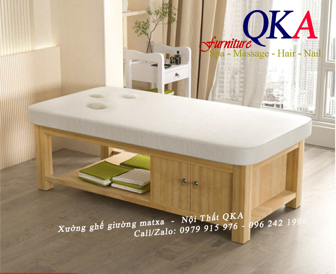 Ngăn chứa đồ: Phía dưới giường có kệ mở và tủ nhỏ, tiện lợi để khăn, gối hoặc các vật dụng spa, vừa gọn gàng vừa tiết kiệm diện tích.